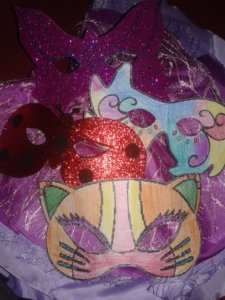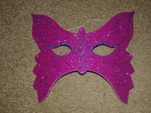 A pillangós maszkot kicsit próbáltam cifrázni. Színeiben pedig a szárnyon használtakat hoztam. Glitter tollal kicsit dekoráltam, és ebbe is gumit tettem.