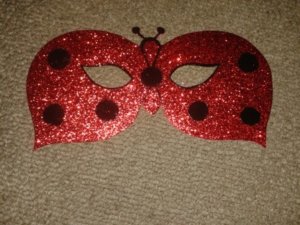 A katicát nem kell nagyon cifrázni hiszen két egyszerű kis szárnya van, azért az orr részen igyekeztem a kis csápos fejét megformázni. És amire figyeltem, hogy kb.: szabályosan legyen a 7 db pettye. Merthogy 7 pettyes katica. A piros csillámos dekorguminak talán a felét ha elhasználtam. Fekete temperával festettem fel a pettyeket és húztam ki a maszk szemszélét. Ezután gumis cérnát tettem bele.