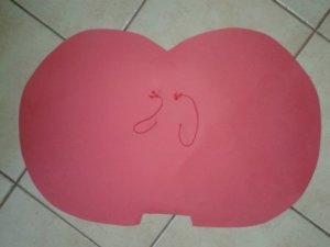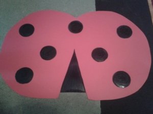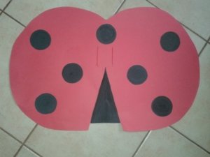 A katicás jelmezhez is kartonból készítettem a szárnyakat. Talán ez volt a legkönnyebb az elmúlt heti munkámból. Besétáltunk egy papír írószerbe és a kapható legnagyobb méretben vettünk egy szép piros kartont – olyat amelyiknek mindkét oldala színes. Itthon kerestem egy képet a katicáról ami nekünk is megfelelő lesz és egy nagyméretű újságpapírra kirajzoltam a fél katicaszárnyat – így teljesen szimmetrikus lesz az átrajzolásnál.