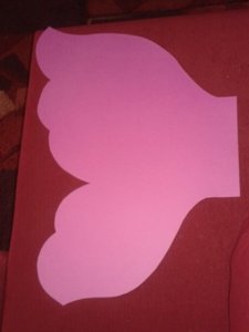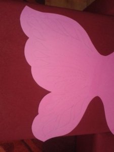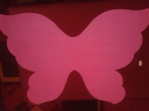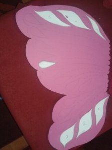 Újságpapíron megrajzoltam a szárny formáját és kivágtam, ezt rajzoltam át a kartonra. Mivel nagy szárnyakat kért a lányom fél szárny került egy kartonra, így ezeket középen később összeragasztottam. Ha a neten körülnézünk rengetegféle szárnyformával találkozunk, lehet onnan is ötletelni vagy egy teljesen sajátot rajzolni mint ahogy én is tettem.