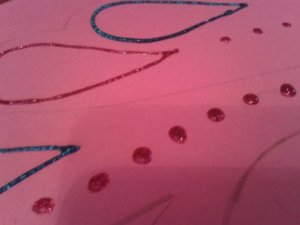 A munka másik nehéz része most jött. Merthogy a csillámtollal át kellett rajzolnom a mintáimat amiket azért előtte halványra radíroztam. A csillámtoll ráadásul jó fél napig száradt, mivel vastagon használtam, hogy ne egysíkú legyen a díszítés.