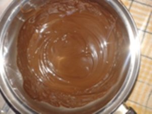 Ehhez a tálcányi kekszhez kb.:5-6 kocka étcsokit kell felolvasztani , én most a húsvéti nyúlcsoki készletből olvasztottam. Természetesen vízgőz felett olvasszuk és amikor már majdnem elolvadt, keverjünk hozzá két evőkanálnyi nutellát. Majd a gőzről levéve, keverjük szépen sima krémmé.