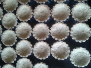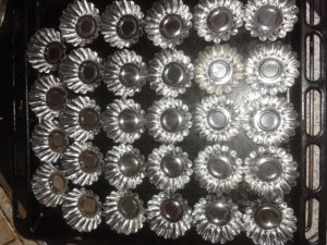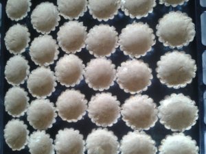 A tésztából kb.: diónyi darabokat szedünk a kezünkbe és szépen belenyomkodjuk a formákba.