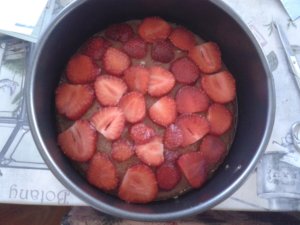A kapcsos forma aljára tesszük a tésztánkat, erre vagy egész epret teszünk vagy eperszeleteket mint én.