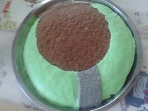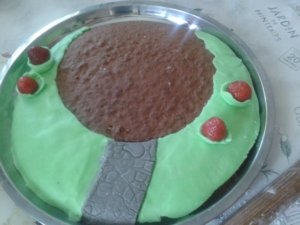 A nagyobbik tészta lesz a rét és a mini vártorony előtti rész ahova majd a hercegnő is kerül. Rámértem a kis torta helyét, így oda nem raktam fondantot, de persze az egészet is be lehet vonni vele. Zöld a mező, a szürke pedig a kapuhoz vezető út, egy kis térkő hatással.