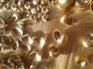 Szóval lássuk csak mire van szükség hozzá. Egy flakon festék spray nálam most fényes arany színben, egy üveg arany színű csillámpor, és a kincsek.