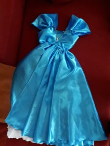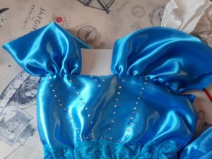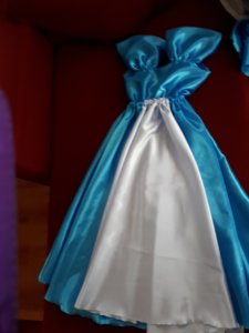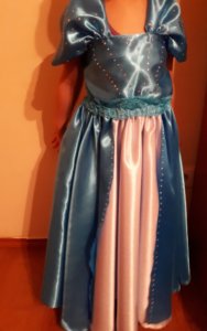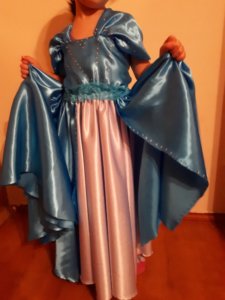 Először naivan gondoltam majd valami szép középkorhoz igazodó szabást készítünk de persze a lányom hallani sem akart róla. Sebaj 🙂 A ruha színén se volt sok vitánk mivel Elzának kék a ruhája. Így aztán elsétáltam a kedvenc anyagboltomba ahol legnagyobb meglepetésemre sikerült egy olyan szép Elzakék anyagot vennem, hogy csuda. 🙂 Tényleg az a jó, hogy egy pici ötlettel nagyon szép egyedi jelmezt lehet a gyerkőcnek készíteni. Ha jó anyagot választunk akkor pedig varrógépre sincs szükségünk hozzá. Mert hiszitek vagy sem ehhez én nem használtam varrógépet, csak tűt és cérnát. Mondjuk az anyagnál figyeltem, és a könnyű fényes bélésanyagot vettem. Ennek a széle könnyen kezelhető foszlás ellen egy kis lánggal. Mivel műszálas óvatosan el lehet égetni a szélét. Vigyázni kell, én egy kis teamécsest gyújtottam meg és 10 perc alatt megvoltam a művelettel.