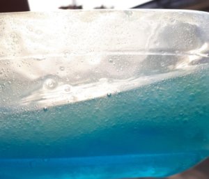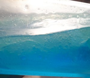 Nekünk így fest alapállapotban. Ha kicsit megdöntjük akkor az olajból nagyobb golyók lesznek, míg ha erősebben összerázzuk igazi buboréktengert kapunk.