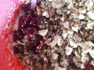 A dió és a meggy kivételével kimérem a hozzávalókat és egy edényben kikeverem én géppel szoktam. Hozzáadom a diót és a meggyet.