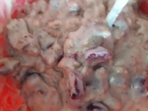 Egy evőkanállal óvatosan összekeverem, hogy azért a meggy ne legyen pépes.