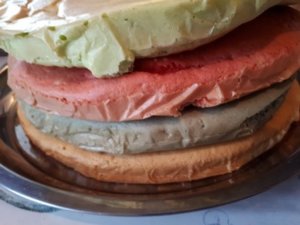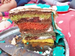 Felvágva pedig teljesült némileg a színes tészta is – bár messze volt a szivárványszínűtől -de a csajok elégedettek voltak vele -és ami fontos finom lett.