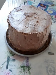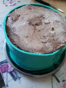 Csokikrémmel szépen körbekenjük a tortát – és jöhet a fondantos díszítés. A fondant receptjét itt találod. Én kéket és fehéret készítettem még előző nap.