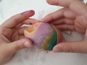 Ha ez megvan és szeretnénk, hogy illatos legyen most érdemes egy két csepp illóolajat keverni bele. Ha készen van akkor lehet ügyesen töltögetni a tojásokat.