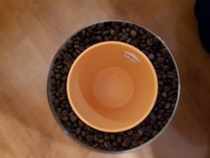 Helyezzük a kaspót az üveg kaspóba és kezdjük el feltölteni a mellette lévő helyet a kávéval.