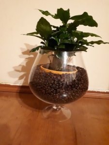 A kávészemek nagyon sokféleképpen felhasználhatóak, finom az illatuk és mutatósak. Egy ilyen csodás díszhez nincs is másra szükség csak egy üveg kaspóra, egy kaspóra amibe a növényünket helyezzük, egy növényre és egész szemű kávéra.