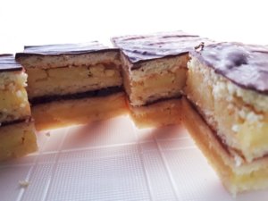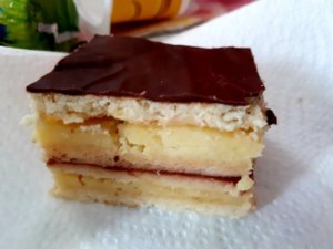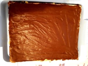 Utána még egy réteg tészta, és vaníliás krém következik majd lezárjuk az utolsó réteg tésztával. Most megolvasztjuk a csokit, amit apró kockákra törve egy edénybe tettem. Az edényt egy másik edénybe helyeztem amiben kevés vizet forraltam így pillanatok alatt megolvadt, közben azt a pár csepp olajat is hozzákevertem. Tényleg csak pár csepp olajra van szükség. Majd szépen elkenjük a sütink tetején.