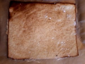 Most már csak össze kell állítanunk egy tálcán a sütit. Kiválasztjuk az első lapot és megkenjük a vaníliás krémünk felével.