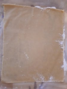 Ha összegyúrtuk akkor 4 egyenlő részre osztjuk, és kinyújtjuk (kb 20*30- as méretben lesz elegendő).