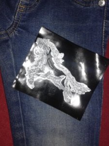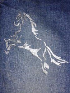 Nem kell hozzá kézügyesség, csak egy tetszőleges sablon amit akár tetoválásoknál is használnak. A hobby boltokban is kapunk ilyeneket. Én ezt a lovat választottam. A tiszta nadrágra szépen felragasztottam, és átkentem textilfestékkel. Én szürkével és ezüsttel is dolgoztam, hogy ne legyen egyszínű a lovacska.