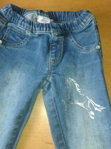 Trend guru nem vagyok, de a lányom szerint egy sima farmer nem szép -szóval ha már megint ezt akarom, hogy hordja (mivelhogy semmi baja a gatyónak és még csak ki sem nőtte) jó lenne ha jól nézne ki. Hát igen nehéz megfelelni egy 5 éves elvárásainak 🙂 Mivelhogy a lovacska a menő nálunk továbbra is, ezért került ez a szuper minta, kb 5 perc alatt a farmerre. Mutatom hogyan.